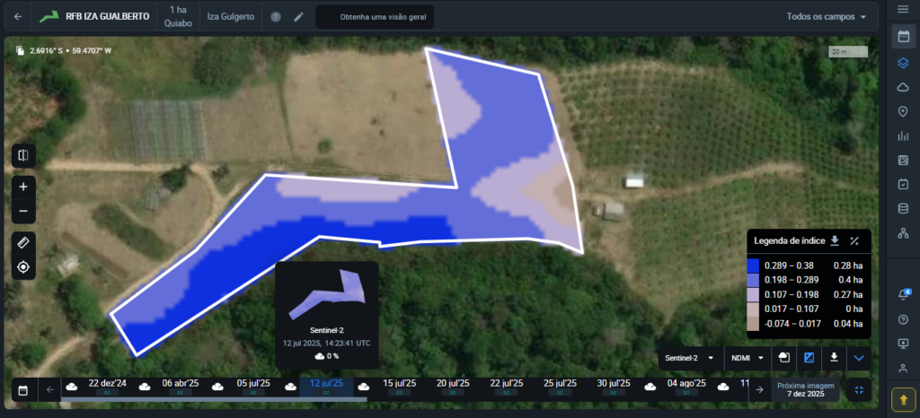 5. NDMI (Índice de Umidade por Diferença Normalizada) na agricultura mede a água nas plantas usando luz infravermelha próxima (NIR) e infravermelha de ondas curtas (SWIR). Auxilia na identificação da falta de água, otimiza a irrigação, planeja a colheita e monitora riscos de incêndio. É essencial para cuidar das plantações e prever problemas hídricos.