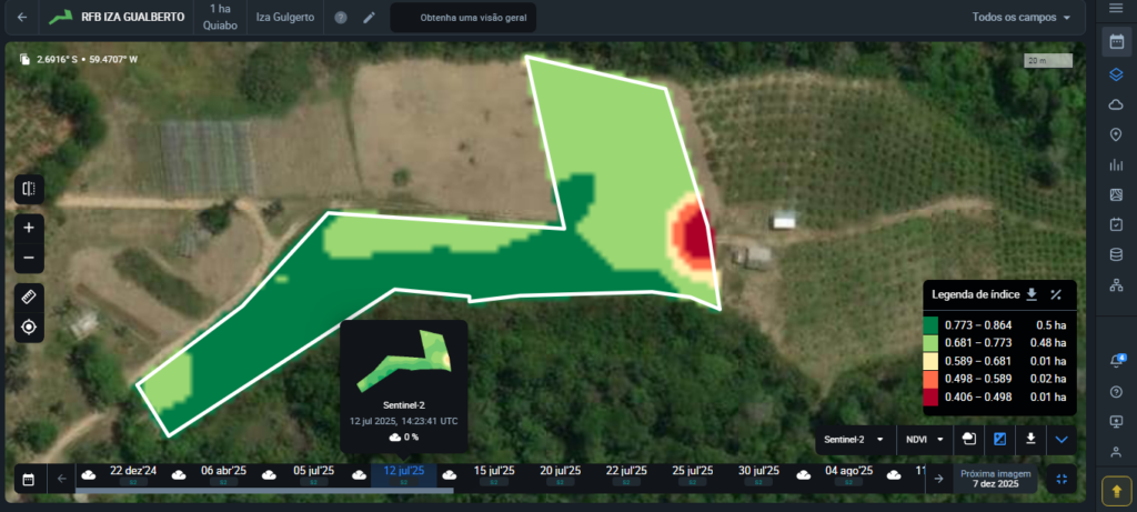 Nosso sistema disponibiliza a constelação de satélites PlanetScop / Sentiel 2 e EOS SAT, com visitações diárias com todas as leituras para alta produção agrícola e acompanhamento técnico do cultivar DECIDIDO, inscrição do cultivar no IPAAM, analise digital e de campo de solo com laudo e correções, rastreamento do cultivar com fulcro na INC 2-2018, geração de qr cód de rastreamento, leitura de nitrato de frutas e verduras, selo de qualidade e muito mais..