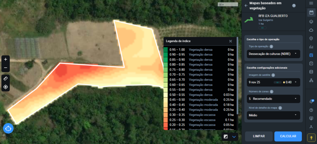 2. NDRE (Índice de Diferença Normalizada da Borda Vermelha) é um índice agrícola para monitorar a saúde das plantas, especialmente em estágios avançados e culturas com folhas densas. O NDRE detecta melhor a clorofila e a necessidade de nitrogênio que o NDVI, pois a luz usada penetra mais fundo nas folhas. Ele complementa o NDVI e é ideal para culturas como milho e cana-de-açúcar, ajudando a mapear variações e planejar a fertilização.
