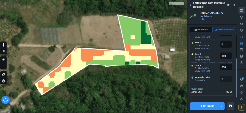 Leitura de Fertilização por Fósforo e Potássio : nas zonas 2 e 3 é preciso adicionar adubo. A correção é feita em menos de 58,72% de 1 hectare, somente onde for necessário.