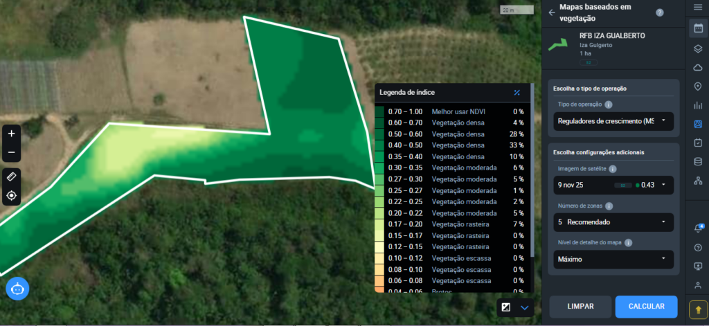 Leitura de Fertilização por Nitrogênio: nas zonas 3 e 4 é preciso adicionar adubo. A correção é feita em menos de 18,82% de 1 hectare, somente onde for necessário.